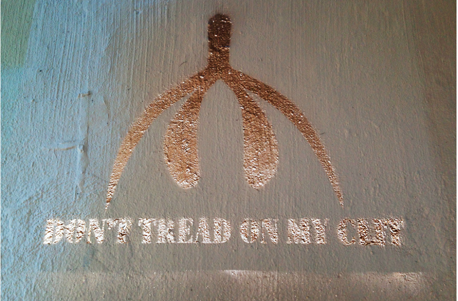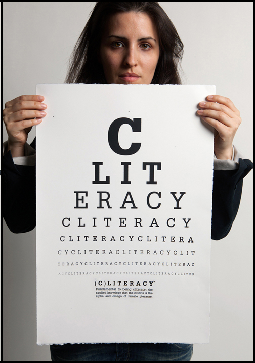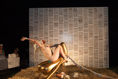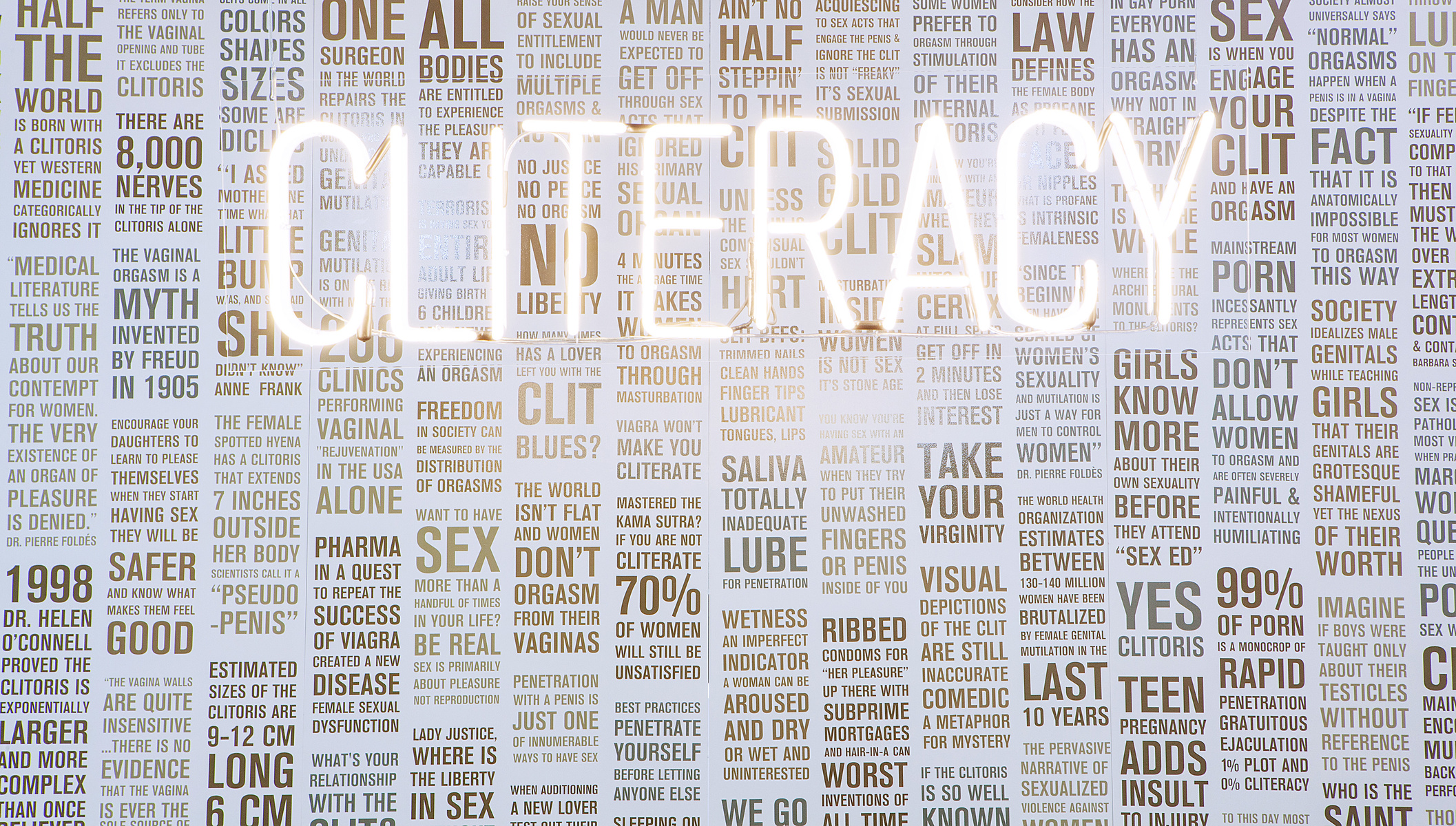 Cliteracy regroupe différentes installations dont un immense panneau de 6 mètres illuminé d’un néon et où sont inscrits une collection d’informations historiques et scientifiques ainsi que 100 lois imaginées avec virtuosité et humour par l’artiste. Sophia déplace aussi son Art dans la rue, elle pose des pochoirs et peint des graffitis dans plusieurs grandes villes des États Unis, qui mettent en scène des clitoris dorés et des slogans comme « Don’t Treat on my Clit ». Avec l’aide de l’artiste plasticien Kenneth Thomas, elle a aussi réalisé un clito doré géant ( exposé au Wassaic Project Summer Festival de New York en août dernier), le public était invité à le monter tel un cheval pour une séance déjantée de Rodéo. Clitoracy c’est également d’immenses panneaux qui mentionnent la loi.57 « Democracy without Cliteracy Phalussy » et des tee shirts unisexe imprimés « Solid Gold Cli ».