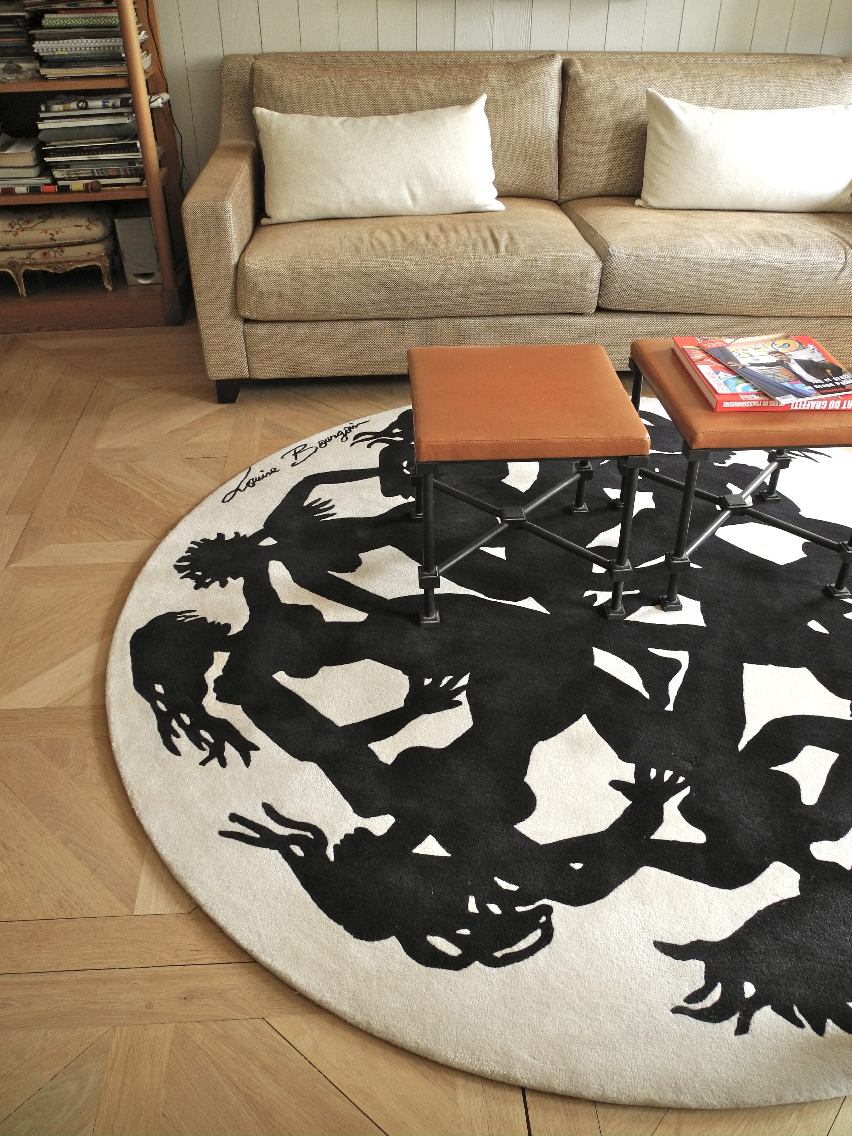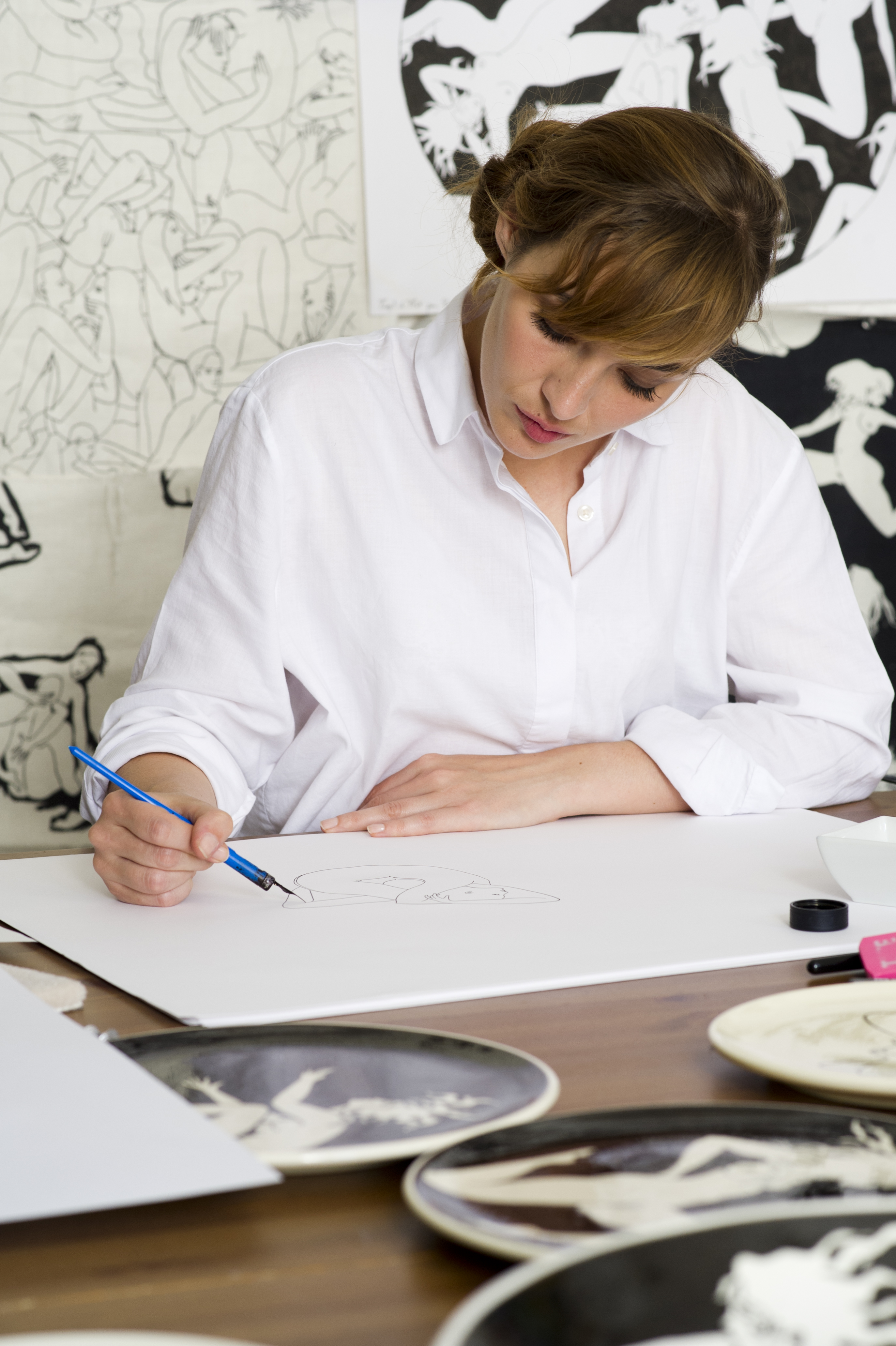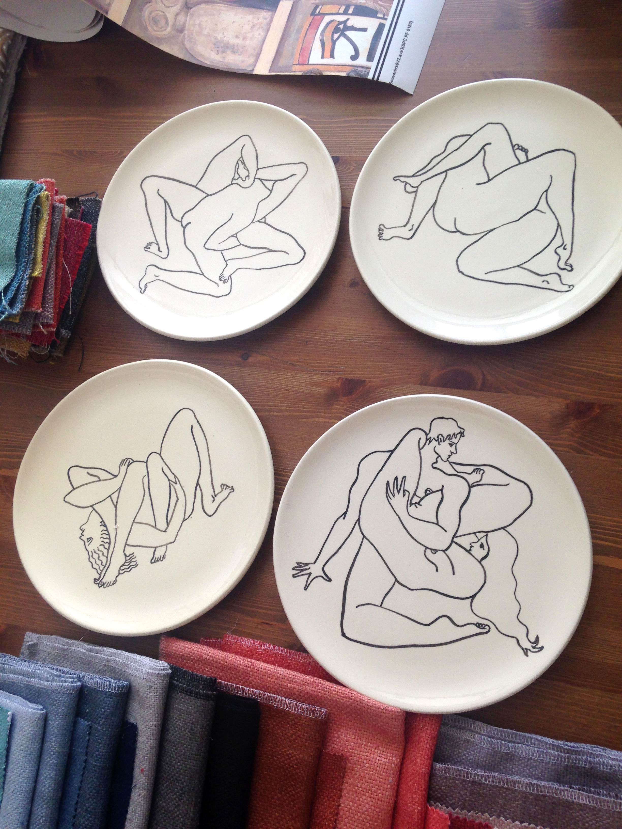 « Ce sont mes dessins les plus intimes, c’est très étrange d’imaginer ça, sur des rideaux chez des gens. » Louise met en scène avec élégance des couples enlacés dans des positions extravagantes, des femmes nues aux courbes généreuses et au regard effarouché dévoilant leur sexe … Ses personnages s’immortalisent sur des assiettes et des plats en céramique fabriqués à la main par le céramiste Vincent Buffile (numérotés en 8 exemplaires), ainsi que sur des tissus imprimés en lin et en coton et des tapis en laine. La collection est en vente dans le showroom de la maison Pierre Frey : 2 rue de Fürstemberg 75006 http://www.pierrefrey.com/collection/pierrefreylouisebourgoin/